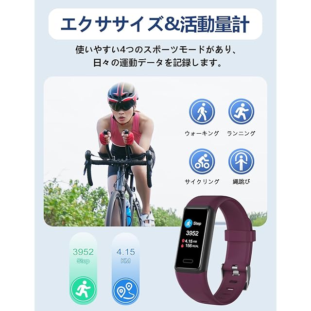 【活動量計&スポーツモード】日々の活動量計をトラッキングするための機能が充実しています。ステップ数、距離を記録します。さらに、ウォーキング、ランニング、サイクリング、縄跳びの4つのスポーツモードを搭載しており、専用アプリで各種運動に最適化された詳細なデータを提供します。これにより、運動データをしっかり把握し、個別に合わせたフィットネス目標を効果的に達成することができます。