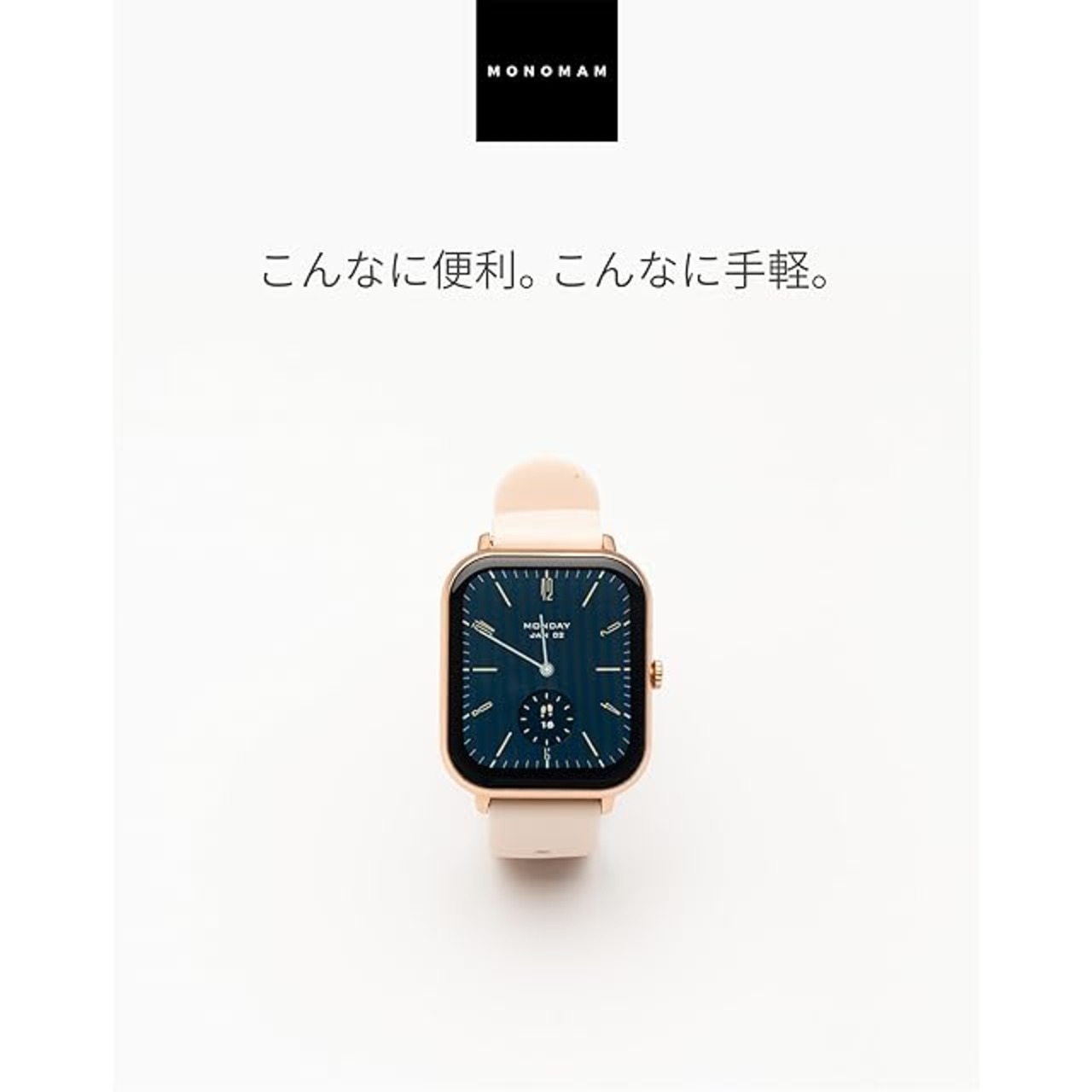 スマートウォッチが登場した初期から販売してきた日本企業からこそ、汲み取れる"本来のニーズ"。クラシックなサイズ、デザインを基調に必要な機能を詰め込みました。今まで頂いたお声を元にバンドのカラーをよりファッショナブルに。機能だけじゃない、カジュアルに楽しめるそんな1台が「MONOMAM」から登場しました。待望のエントリーモデルです。
