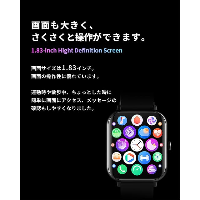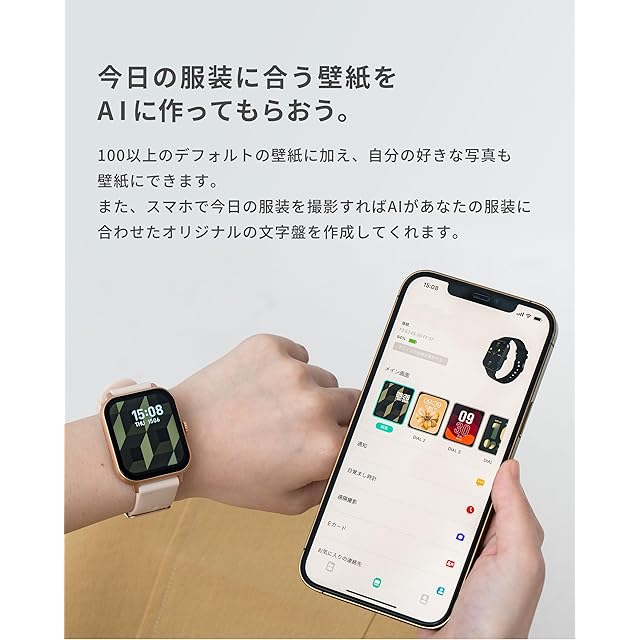 【今日の服装に合う壁紙をAIに作ってもらおう】100以上のデフォルトの壁紙に加え、自分の好きな写真も壁紙にできます。また、スマホで今日の服装を撮影すればAIがあなたの服装に合わせたオリジナルの文字盤を作成してくれます。弊社インスタグラムで配布中のオリジナル壁紙もQRコードでダウンロードが可能♩画面サイズは1.83インチ。画面の操作性に優れています。運動時や散歩中、ちょっとした時に簡単に画面にアクセス、メッセージの確認もしやすくなりました。