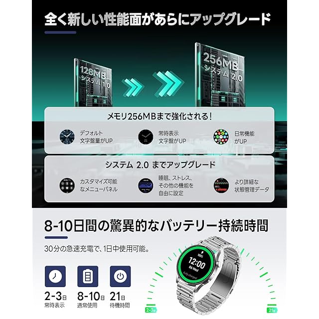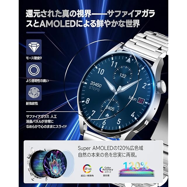 【全く新しい Super AMOLED スマートウォッチ】このFOSMET QS40 Proビジネススマートウォッチは、軽量かつ薄型の設計により、よりスタイリッシュでコンパクトな丸型スマートウォッチデザインを実現しています。サファイアガラススクリーンを引き続き採用し、新たに1.43インチの超薄型Super AMOLEDディスプレイを搭載(前モデルQS40のAMOLEDと比較して、より鮮やかな表示、薄型化、省電力化、視認性向上)。これにより、色の再現性がさらに向上し、新しい視覚体験をお届けします。 サファイアガラスの採用と高リフレッシュレートの相乗効果により、画面のスライド操作が非常にスムーズで、驚くほど滑らかな反応を実現しています。さらに、肌に優しいシリカゲルバンドも採用しており、ビジネスシーンはもちろん、プライベートシーンでも活躍します。あなたのファッションセンスにぴったり寄り添うこのスマートウォッチは、高級腕時計の代表格となるでしょう。