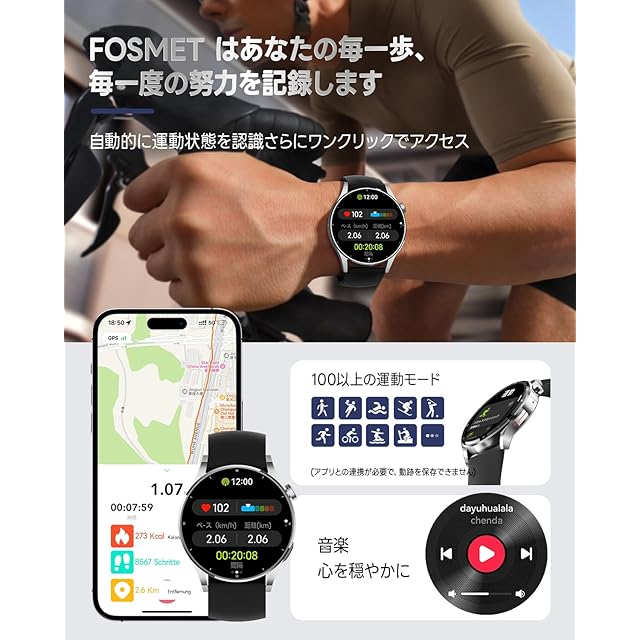 【150種類以上の運動モード&IP68防水&アプリとのGPS連動で、あらゆるアクティビティに対応】このスポーツスマートウォッチは、150種類以上のワークアウトモードを内蔵しており、ウォーキング、ランニング、サイクリングなど、ほぼすべてのエクササイズに対応します。さらに、Fosmet Fitアプリと連携することで、運動中にスマートウォッチからアプリを通じて正確なGPS位置情報を取得し、リアルタイムで移動ルートや距離を記録できます。これにより、スポーツの魅力を最大限に引き出します。(※GPS機能は内蔵されていませんが、Fosmet Fitアプリとの連携によりデータや軌跡マップを表示可能です。) また、新たに運動の自動検知機能を搭載しており、運動中であることを感知すると、ウォッチがリマインド通知を行います。通知をタップするだけで、簡単に運動を開始できます。さらに、IP68防水規格に対応しているため、水泳や雨天時でも安心して使用できます。