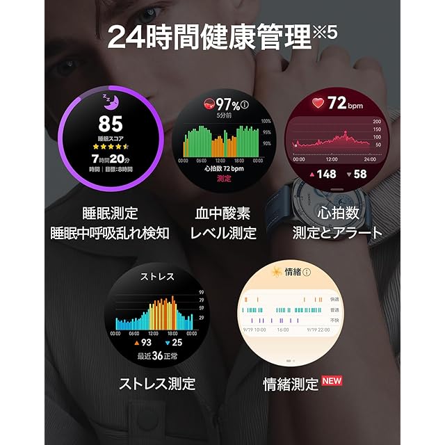 【24時間健康管理】 睡眠中呼吸乱れ検知、心拍数、血中酸素レベル、ストレスの測定に加え、新たに情緒をリアルタイムに測定する機能を追加。長時間不快が続き際は、呼吸エクササイズの提案通知により気分転換を手助けします。