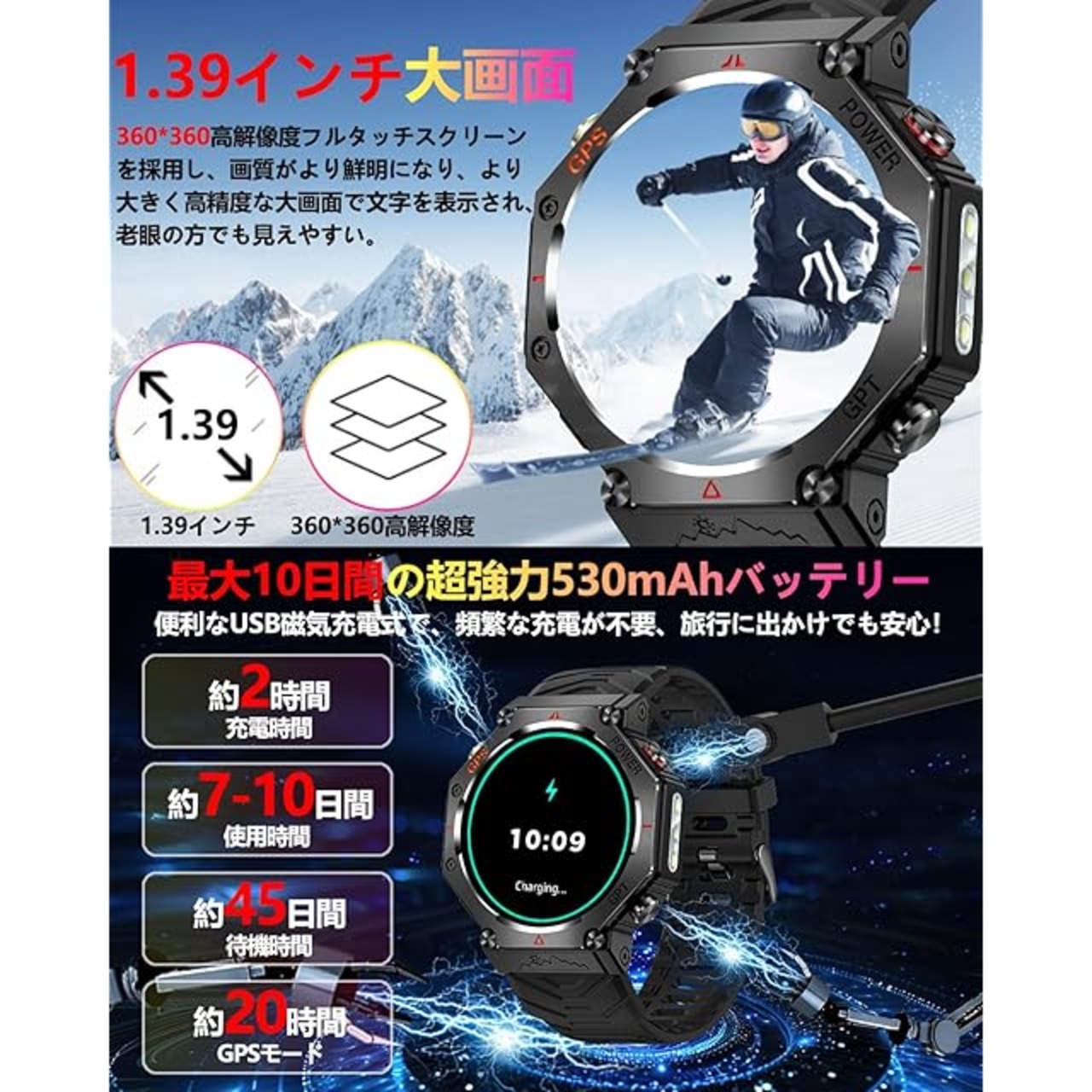 【軍用規格スマートウォッチ&1.39インチ大画面&超高輝度懐中電灯付き】スマートウォッチは特殊な複合材料を採用され、耐低温、耐高温、耐衝撃、防水防塵など、多くの軍用標準テストに合格することができます。スポーツウォッチは、間違いなく野外活動のようなときにあなたの信頼できる仲間になることができます。Smart watchの画面は耐衝撃性のガラスが採用するため、耐久性と傷がつきにくくなっています。日常から過酷な自然環境まで、あらゆるシーンで適用されます。1.39インチのカラースクリーンを搭載され、360×360ピクセル高解像度で、太陽光の40%を反射する性質があり、大きなフォントで屋外でも老眼の方でも情報やデータが見やすく表示されます。そして、進化した三つのLEDライトが搭載され、輝度が通常の時計よりもっと高くなり、夜間のアウトドアスポーツでも、室内生活の照明でも、災害を起こった時でも、隅々で照らしてくれます。更に、SOSモード、ロービームモード、ハイビームモード、警告モードなどの四つの点灯モードがあり、各種類のシーンに適用!