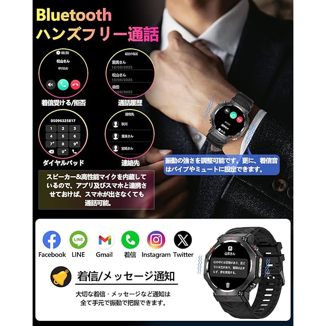 【Bluetooth5.3通話機能とメッセージ通知一体】 業界最先端のBluetooth 5.3を採用し、従来のスマートウォッチの通信問題を大幅に改善し、電池寿命、通信速度、通信範囲、接続の安定性も大幅に向上し、省エネ性も強化された。iPhoneおよび(Android)アンドロイドに対応しているスマートウォッチはスピーカー&高性能マイクを内蔵し、スマホを取り出さず装着したまま音声通話ができます。電話に出たり通話したり、連絡帳・履歴から電話をかけたりできます。運転、家事、運動中で両手を解放し、生活と仕事の素晴らしいアシスタントです。また、スマホとペアリングすると、Line、SMS、Twitter、Facebook、Instagramなどのソフト情報はバイブレーションで快速的に通知されます。一切の大事な連絡を絶対に見逃しません。運動中や会議中はわざわざスマホを取り出す必要がありません。さらにスマートウォッチ本体でバイブの強さを「弱・強」の中から選ぶことができ、着信音の出るやミュートも設定することができます。
