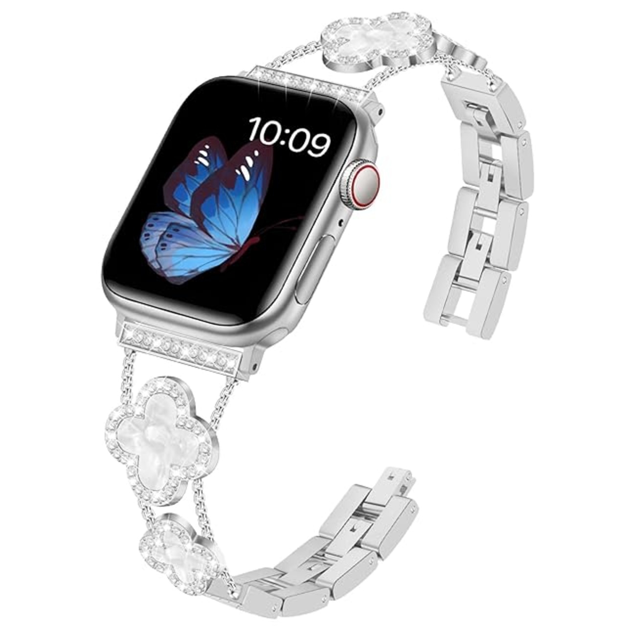 ブリンブリン ダイヤモンド レディース バンドコンパチブル Apple Watch バンド 49mm 46mm 45mm 44mm 42mm 41mm 40mm 38mm Ultra SE Series 10 9 8 7 6 5 4 3 2 1 かわいいラッキークローバー ドレッシー交換用ブレスレットと互換性あり(シルバー)