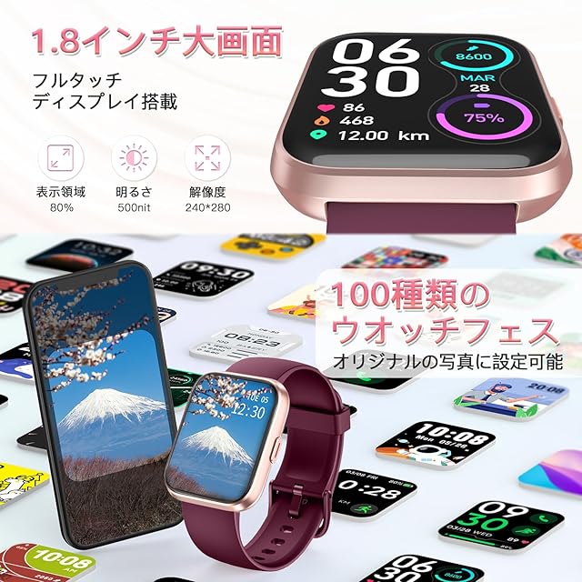 ♂【100種類の運動モード&1.8インチ大画面DIY 100種類文字盤】 100種類のスポーツモードに対応しており、日常のトレーニングに満足できます、ここからは今までやったことない運動を試して見ましょう。カロリはすごく消耗されるかもしれません。なお、加速度センサーを搭載され、歩数・距離・消費カロリー・運動時間などを自動的に記録可能です。運動的な習慣を身につけるように毎日スマートウォッチをつけて運動していきましょう。本製品は、画面の文字盤をお好みでカスタマイズすることができます、好きな写真をスマートウォッチのデスクトップに変換可能です。更にアプリ内は100種類の文字盤を自由にダウンロード可能です。