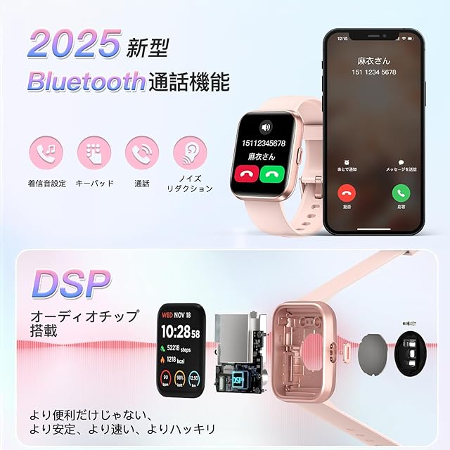 【通話機能付き&DSPオーディオチップ搭載】 ★スマートウォッチをタップするだけで通話可能であり、キーパッド付で電話をかけることができます、電話帳の作成、着信履歴の記録、更に、この便利性にDSPオーディオチップを搭載、安定性に高性能を加えます‥★「DSPオーディオチップって?」--DSPを搭載したら、複雑なアナログ回路だと、回路内でどうしても発生しがちなノイズや音質劣化とは全く無縁で、低ノイズで劣化の少ないエフェクト音が得られる。そこで、より安定、より速い、より高音質な通話体験を提供いたします。