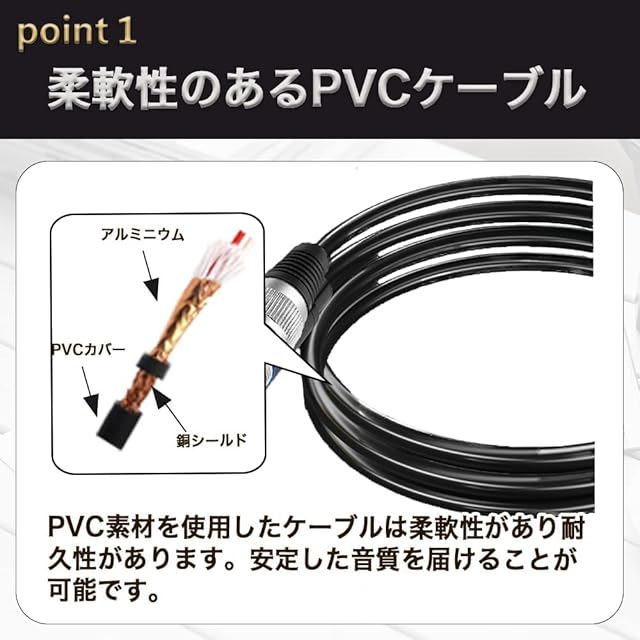 【柔らかく柔軟性のあるPVC素材ケーブル】ケーブル部分には柔軟性があるPVC素材を使用しています。柔らかい素材ではありますが耐久性は抜群で安定した音質を届けることができます。