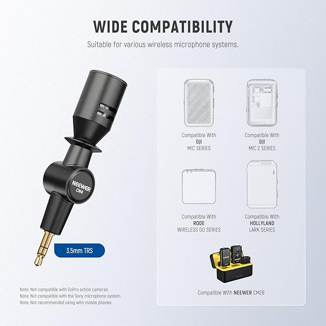 【3.5mm TRSコネクタ】3.5mm TRSジャック付きDSLRカメラ、ビデオカメラ、ラップトップ、レコーダー、無線マイク送信機(NEEWER CM28、CM28 Pro、CM28 Ultra、CM31など)に適しています。コンパチブル Rode Wireless Go II、コンパチブル DJI Mic。GoProには対応しません。ソニーマイクシステムには対応しません。