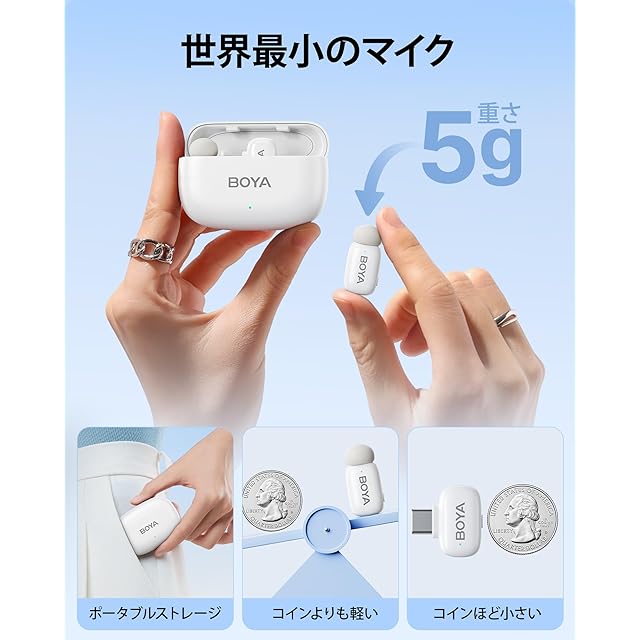 BOYA miniワイヤレスマイク【超ミニ360°集音ピンマイク】タイプc&Lightning無線マイク iPhone 16シリーズ対応 Android&iPhone用 USB-C 瞬時接続 ノイズ軽減 プラグ&プレイ 伝送距離100m 2人用 AI音声変換 38時間連続使用 クリップ式 Vlog撮影/動画配信/生放送等に対応 収納充電ケース付き(Type C&Lightning機種対応)白