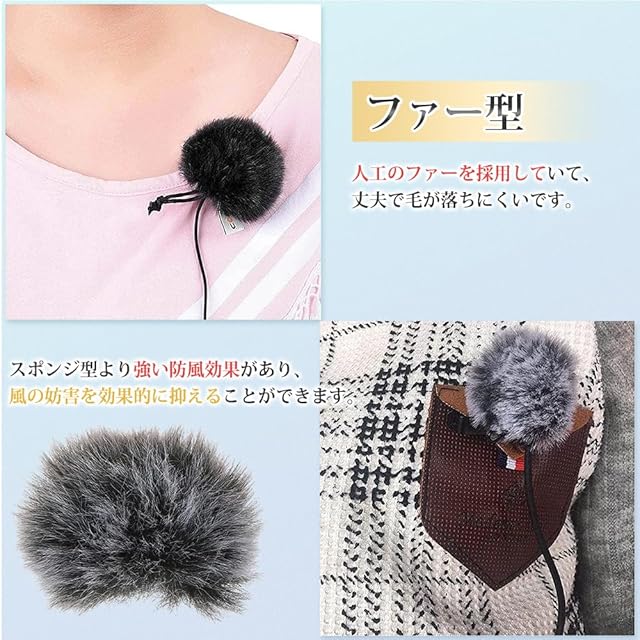 【ファー型】人工のファーを採用していて、丈夫で毛が落ちにくいです。スポンジ型より強い防風効果があり、風の妨害を効果的に抑えることができます。
