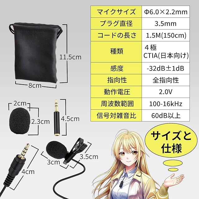 マイクサイズ:Φ6.0×2.2mm、プラグ直径:3.5mm、コードの長さ:1.5M、種類:4極・CTIA規格