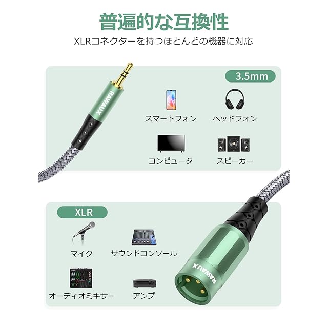【用途】: XLRオス-3.5mm変換ケーブルは、ステレオミニジャック出力を持つほとんどの機器を、XLR入力を持つミキサーやアクティブスピーカーに接続するのに理想的です。
