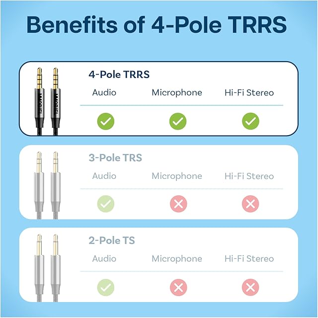 高性能マイクノイズ低減テクノロジー - Aux オーディオケーブルにより、マイク入力がオーディオ信号を詳細かつ正確に記録できるようになります。これにより、安定した本来の音声が得られ、伝送遅延がなく、ノイズを気にする必要もありません。
