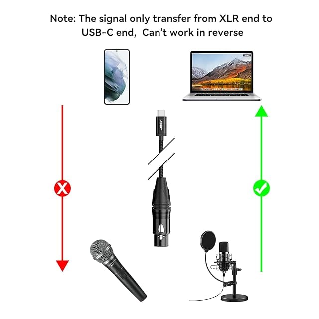 【使用上のご注意事項】コンデンサマイクと一緒に使用する場合は、録音に十分な電源を確保するため、追加の48Vファントム電源が必要です。本 XLR to C タイプ変換ケーブルは、XLRからUSB Cに信号を転送するのみです。逆方向の転送は不可です。