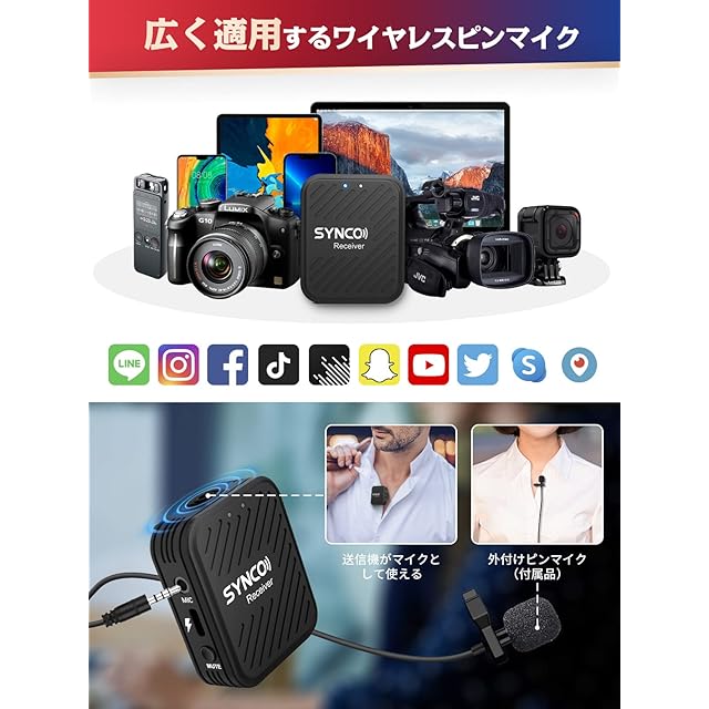 ワイヤレスマイク, SYNCO G1(A2) 一眼レフカメラ/パソコン/iPhone/Androidスマホ用 ワイヤレスピンマイク 音量調整 ミュート機能 ノイズキャンセリング 送受信機セット セミナー講座/オンライン授業/動画撮影, ピンマイク-ワイヤレス-iphone用ピンマイク-一眼レフ-wireless mic