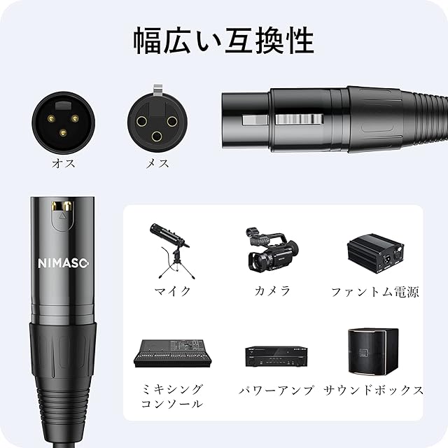 【対応デバイス】本コンデンサマイクケーブルは全てのXLRコネクタ(3ピン)が搭載する機器に対応できます。例え:AT2020、CUSTOMTRY-CM2000、シュアー SM58、Marantz MPM-3000、Yamaha AG03/AG06、AKG C3000B、PIONEER DJM-250等です。