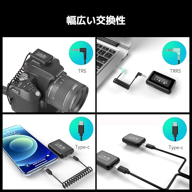 「幅広い交換性」AWM20T ワイヤレス ラベリアマイク システムはさまざまなデバイスと互換性があります。 RXをラップトップ/電話/タブレットに接続するためのType C-Type Cケーブル、DSLRカメラ用の3.5mm TRS - TRSケーブル、および3.5mmコンピュータ/電話/タブレット用の3.5mm-TRS - TRRSケーブルインターフェイスが含まれています。 充電TX/RX/充電ケース用の2-in-1Type-Cケーブルも付属され、 この多用途性により、どのカメラ/コンピュータ/デバイスでも高品質のオーディオを録音できます。