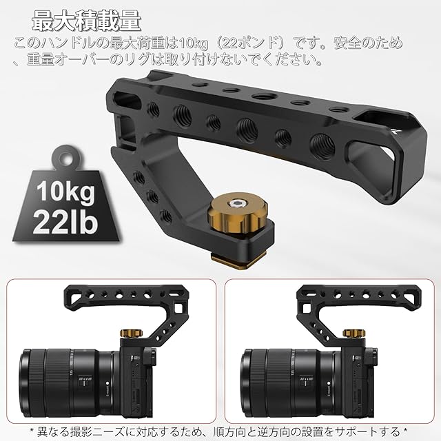 コールドシューマウント付きトップハンドル、カメラケージ用軽量ハンドルグリップ、カメラケージ、マイク、LEDライト、モニター用4コールドシュー&1/4"&3/8 "ホール付きユニバーサルカメラトップハンドグリップ
