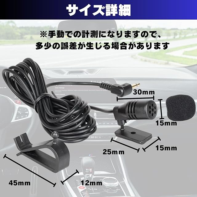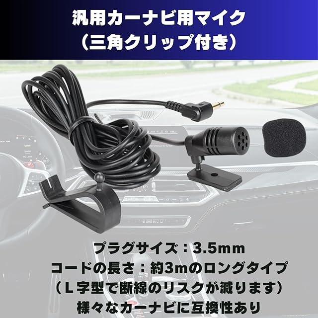 ジャックサイズ3.5㎜の車用三角クリップ付きカーナビマイクになります。シンプルで飽きのこないブラックカラーを基調としたナビ マイクで、マイク・ケーブル・プラグ・クリップで構成されております。 このカーアクセサリーのクリップ部分をサンバイザーやダッシュボードにセットすることで、ハンズフリーマイクにてナビゲーションシステムに音声入力が可能となります。 ユニバーサルで普遍的なデザインの為、どんな車内にも溶け込みます。音声認識のカーナビ等にご利用できる外部装着のナビマイクになります。プラグの部分は直角になっており、ソケット部分に無理なく装着可能です。プラグの首の部分に無理な力が働いて生じる断線のリスクが少ない構造となっております。サイズ・形状をご確認の上お買い求め下さい。 【サイズ】プラグ:3.5㎜ 全長3m マイク部分:2.5×1.5cm×1.5cm クリップ部分:4.5×3×1.2cm 説明書はありません。お使いのPC・モバイル環境によって商品の見え方が異なる場合がございます。