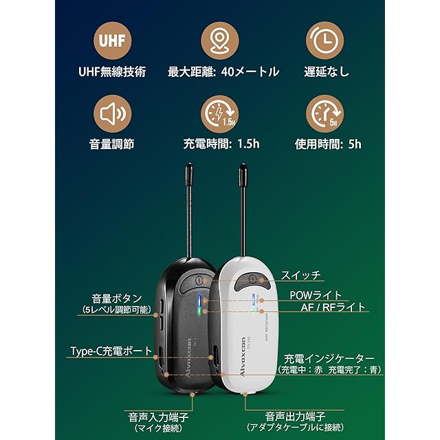 【2人用ワイヤレスマイク】:この製品は1台の受信機と2台の送信機のセットで、送信機と受信機をオンにするだけで1秒で自動ペアリングが完了します。初心者でも簡単に使用でき、インタビュー、Vlog、スピーチ、ビデオ撮影などに最適です。※ご注意:混信の可能性があるので、40メートル以内に複数セットを一緒に使用することは勧められません。