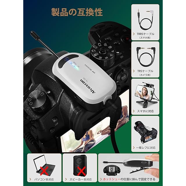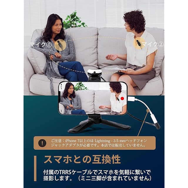 【スマホ用ワイヤレスマイクのおすすめ】:このマイクは大部分のスマートフォンと互換性があり、ソフトウェアのインストール不要で、付属のTRRS変換ケーブルを使ってスマホに接続するだけで、録音/録画アプリを開いてすぐに使用できます。※ご注意:iPhoneをご利用の方は、別途3.5mm-lightning変換ケーブルの購入が必要です。