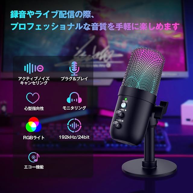 コンデンサーマイク USB マイク ゲーミングマイク PC マイク 卓上 192kHz/24bit アクティブノイズキャンセリング エコモード搭載 RGBライト カーディオイド 静音機能付き 高感度 集音 多機能 プラグ&プレイ パソコン対応 配信/録音/ゲーム/会議用 Windows/Mac/PS5対応