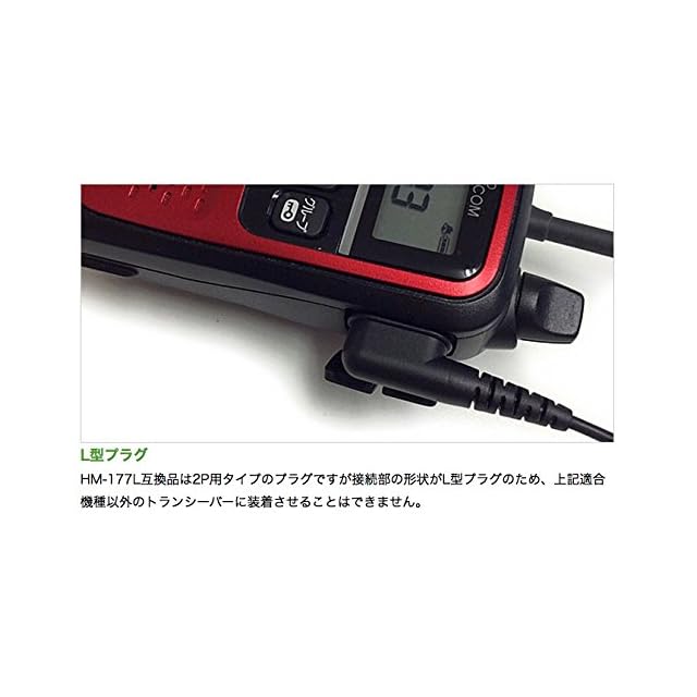 アイコム L型2ピン用 特定小電力 トランシーバー用 2WAY インナー式or耳掛け式 高感度 高音質タイプ IC-4120 IC-4120BT IC-4100 IC-4100D IC-4110 IC-4110D IC-4188D 用 <br> <br> アイコムの2ピンタイプの機種に、対応のイヤホンマイクです <br> <br> ・2WAY インナー式or耳掛け式兼用になっています <br> ・360度回転可能な服に挟める小型クリップ付きです <br> ・本体を持たなくても イヤホンマイクのPTTボタンを押すだけで交信可能です <br> ・PTTスイッチとマイクは一体型で高感度・高音質タイプです。 <br> <br> 【ケーブルの長さ】 <br> ・イヤホン部~マイク部まで:約77.0cm(360度回転小型イヤホンクリップ付) <br> ・マイク部~コネクター部まで:約100cm <br> <br> ●HM-177L互換品は2ピンタイプのジャックですが接続部の形状がL型プラグのため、下記適合機種以外のトランシーバーに装着させることはできません。 <br>適合機種 <br> IC-4120 IC-4120BT <br>IC-4100 IC-4100D <br>IC-4110 IC-4110D <br>IC-4188D <br>他<br> ※同時通話には対応しません。 <br> <br> ※こちらの商品は、VOX機能には対応しておりません。
