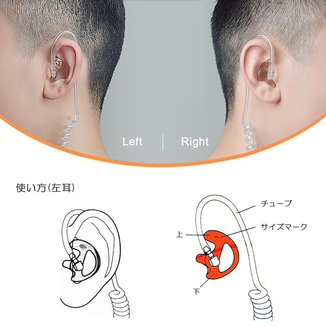 イヤホン部はエアチューブを採用します。カール部分を耳の後ろに廻せば、前から見たときにコードが目立ちにくくなります。片耳で、左右どちらの耳にも掛けられます。PTTボタンとマイクが一体型なので、トランシーバーを持たなくても、イヤホンマイクのPTTボタンを押すだけで交信可能です。