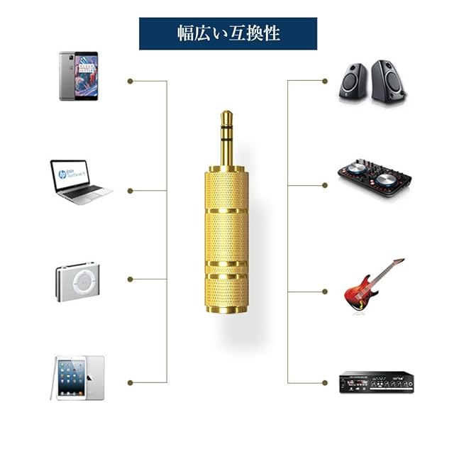 電子ピアノ、キーボード、ギター、プレーヤ、スピーカー等6.35mmステレオ標準プラグとイヤフォン、ヘッドフォン、PC、スマホン等3.5mmジャク付きデバイスに適用できます。