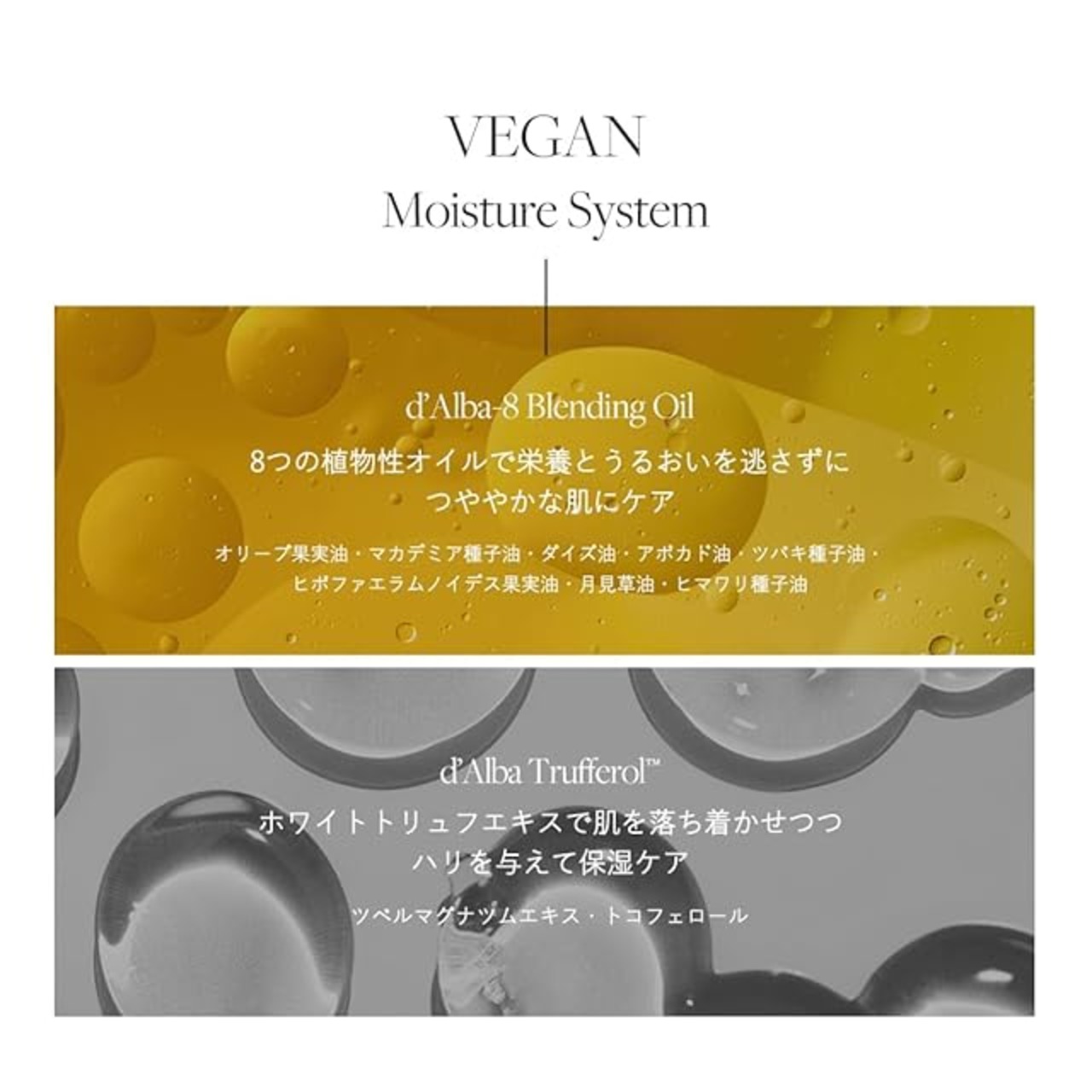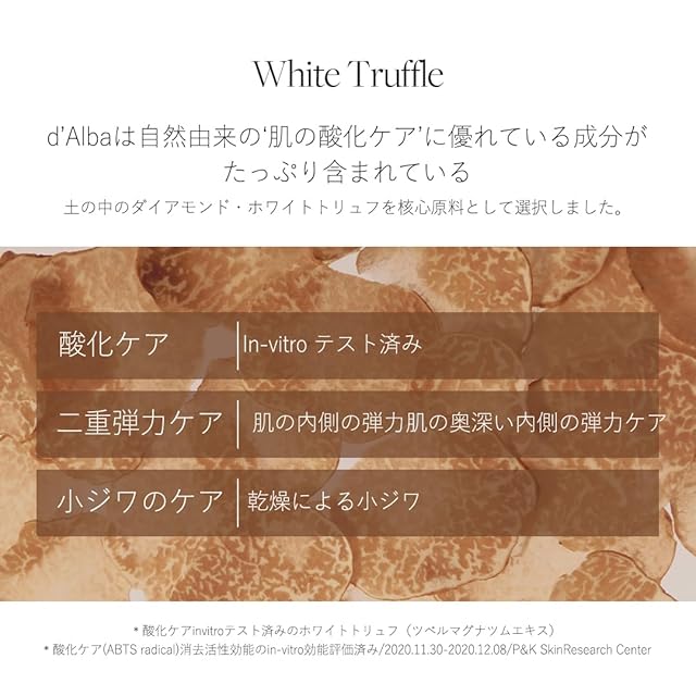 ダルバ独自の弾力ライセンス成分トリュフェロール (イタリア産ホワイトトリュフʻツベルマグナツムエキスʼ+肌の弾力と保湿をケアするʻトコフェロールʼ) でつややかでハリのある肌にケアします。