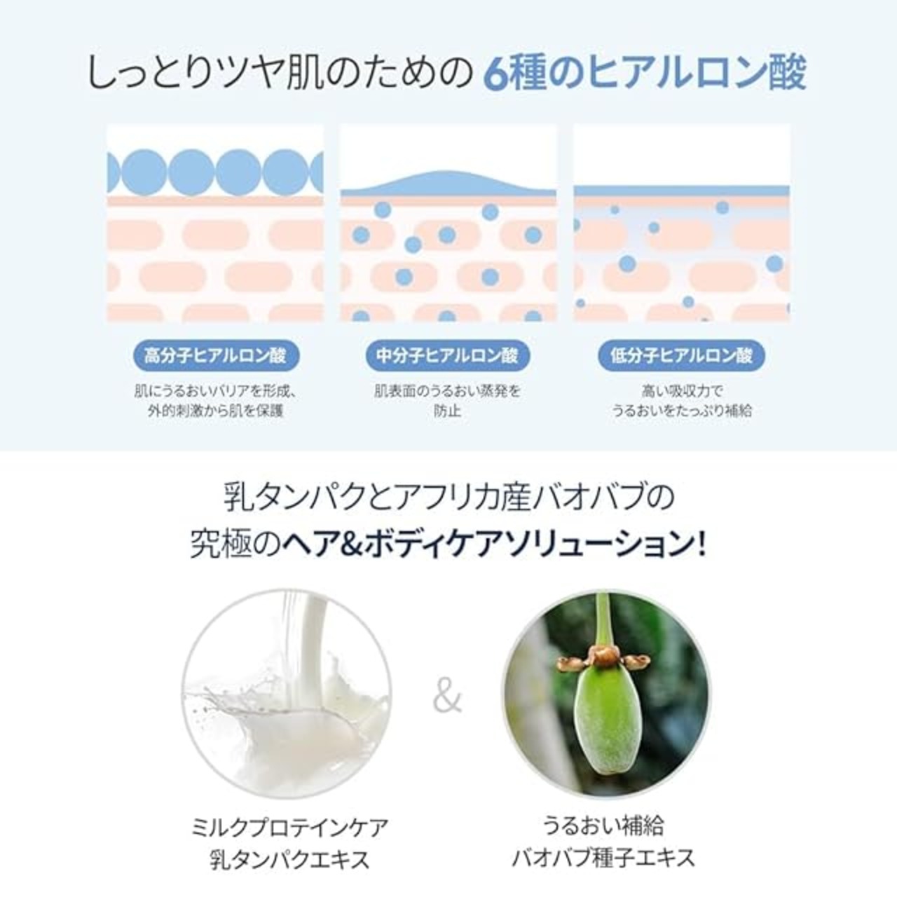 水、ラウレス硫酸Na、ラウリル硫酸アンモニウム、コカミドメチルMEA、香料、塩化Na、コカミドプロピルベタイン、BG、ハナハッカ葉エキス、セイヨウシロヤナギ樹皮エキス、ヒノキ葉エキス、スベリヒユエキス、カシア樹皮エキス、オウゴン根エキス、乳酸桿菌/ダイズ発酵エキス、サボンソウ葉エキス、グリセリン、乳タンパクエキス、バオバブ種子エキス、1,2-ヘキサンジオール、ヒアルロン酸Na、ヒアルロン酸クロスポリマーNa、加水分解ヒアルロン酸、ヒアルロン酸、加水分解ヒアルロン酸Na、ポリソルベート20、ナイアシンアミド、ベタイン、安息香酸Na、パンテノール、クエン酸、クエン酸Na、EDTA-2Na、α-イソメチルイオノン、安息香酸ベンジル、サリチル酸ベンジル、クマリン、ゲラニオール、リナロール