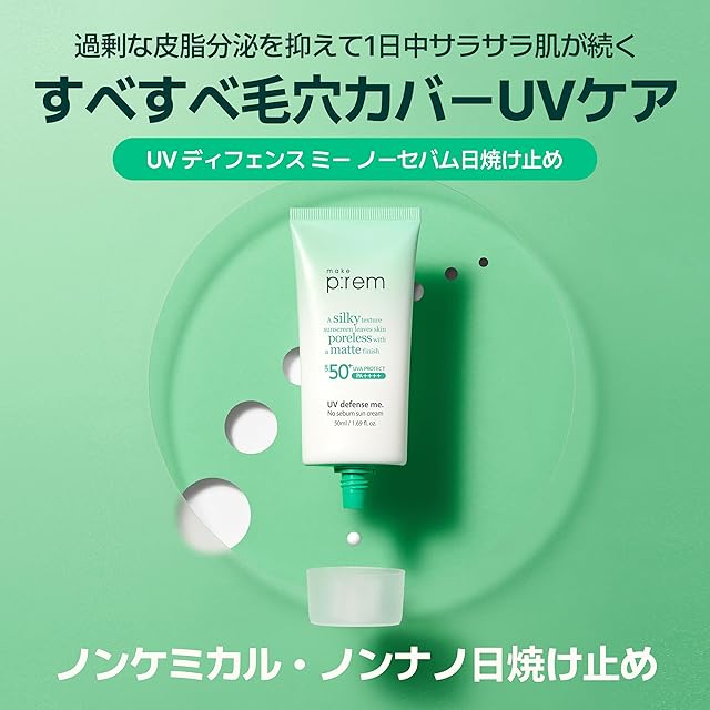 UVディフェンスミーノーセバム: 日焼け止めSPF 50+ PA++++ 50ml 海の自然を守るシルキーテクスチャー日焼け止めで毛穴レスなマットな仕上がり、UVA/UVB保護機能、6時間テカリ抑制及び臨床検証で確認された毛穴ケア効果。