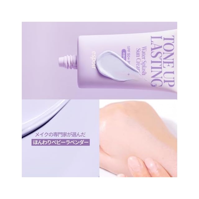 ベイビーラベンダーでコレクティング効果 : メイクアップ専門家が選び抜いた「ふんわりベイビーラベンダー」トーンアップ日焼け止め! 黄色味を補正するパープル+赤みを抑えるブルー、その間にあるエスポアだけのベイビーラベンダーカラー。 2つの補色効果により、どんな肌トーンでもくすみ感なく、透明感のあるワントーンアップ!ナチュラルで健康的な透明感をプラス。