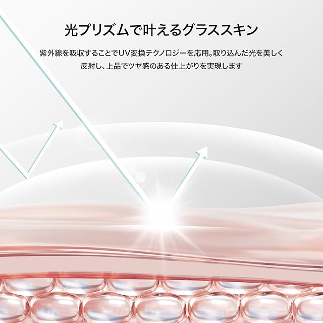 【光プリズムで叶えるグラススキン】紫外線を吸収することでUV変換テクノロジーを応用。取り込んだ光を美しく反射し、上品でツヤ感のある仕上がりを実現します。 お肌の温度でとろけて密着する「温感反応スキンメルティングテクノロジー」を加え、ワンタッチでしっかり密着。きめ細やかなグラス陶器肌を長時間キープします。