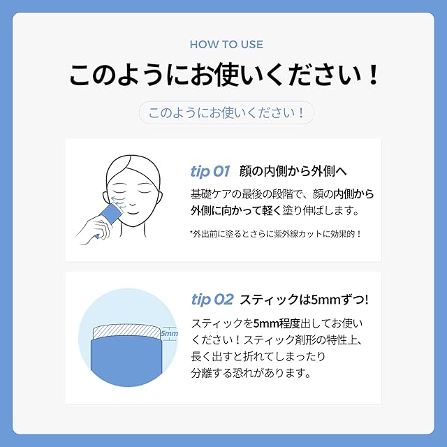 テクスチャー:ベタつき感なく、使用後に白浮きもしない軽い使用感のサンスティックです。