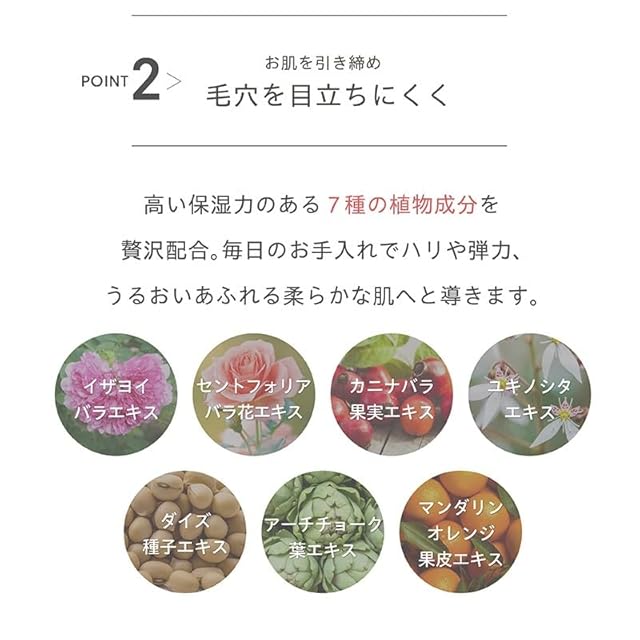 【厳選した7種のボタニカル成分】お肌を引き締め毛穴が目立ちにくい滑らかな肌へ導く!高い保湿力のある 7種の植物成分を贅沢配合。毎日のお手入れでハリや弾力、うるおいあふれる柔らかな肌へと導きます。