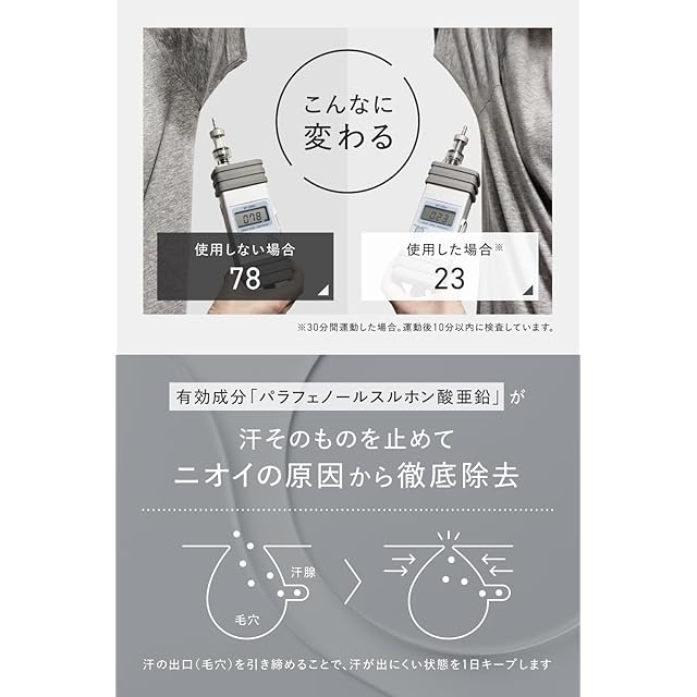 【肌にやさしい低刺激処方】肌へのやさしさにこだわり、パラベン・エタノールなど8つの成分をフリーに。デリケートな肌にも使いやすい低刺激設計です。毎日使えるやさしさと、気になる汗とニオイをまとめてケアする頼れる1本です。