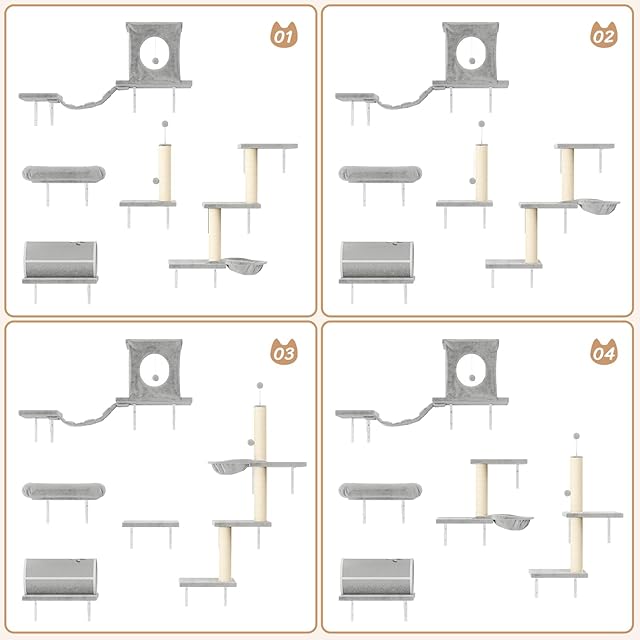 【品質保証&取り付けやすい】猫用家具セットには壁にしっかりと固定するための高品質な製品と取り付けアクセサリーが付属しているので、お子さまは自分で遊び場を組み立てることができます。詳しい説明書が同梱されており、電動ドリルだけで簡単に取り付けられます!どんな活発な猫でも安全に使用できます。当社の猫用家具は保証付きです。ご質問や問題がございましたら、お気軽にお問い合わせください。私たちは常に高品質のサービスを確保し、お客様のペットのために快適で楽しい環境を提供することを約束します。