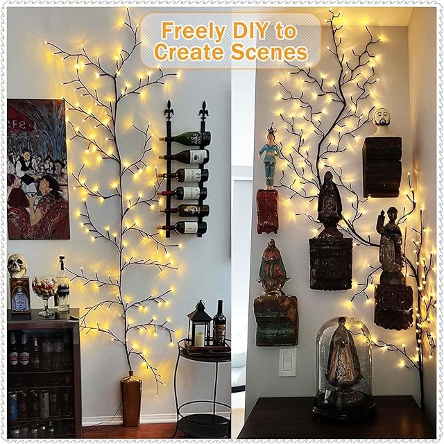 ⭐【取り付け簡単】籐の木の枝ライトには跡が残らない透明な接着剤が付いているので、壁に掛けるのに役立ちます。 コードフック、吸盤、ワイヤークリップを使用して壁に掛けることもできます。
