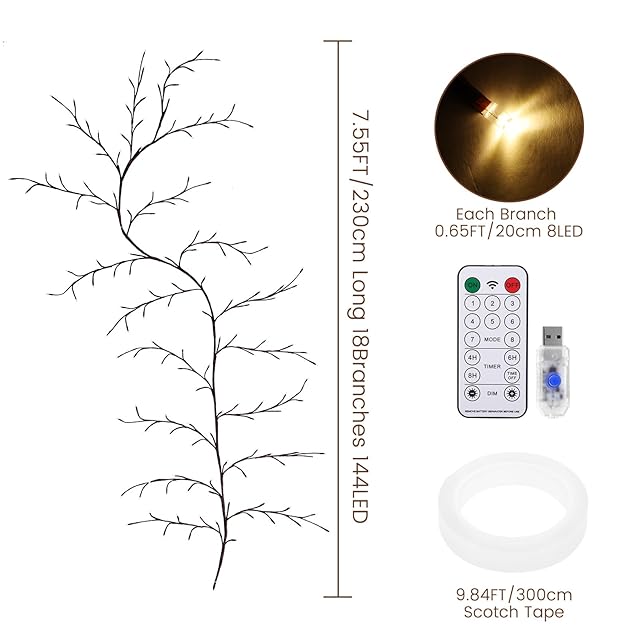 ⭐【パッケージ内容とサイズ】:パッケージに含まれるもの:1 * ラタンブランチライト、1 *ノンマーキング透明接着剤、1 *リモコン;枝の長さは約2.3Mで、装備されています。 2メートルの長さで十分な長さです。低電圧透明ワイヤ、低電圧USBインターフェースは安全で便利です。
