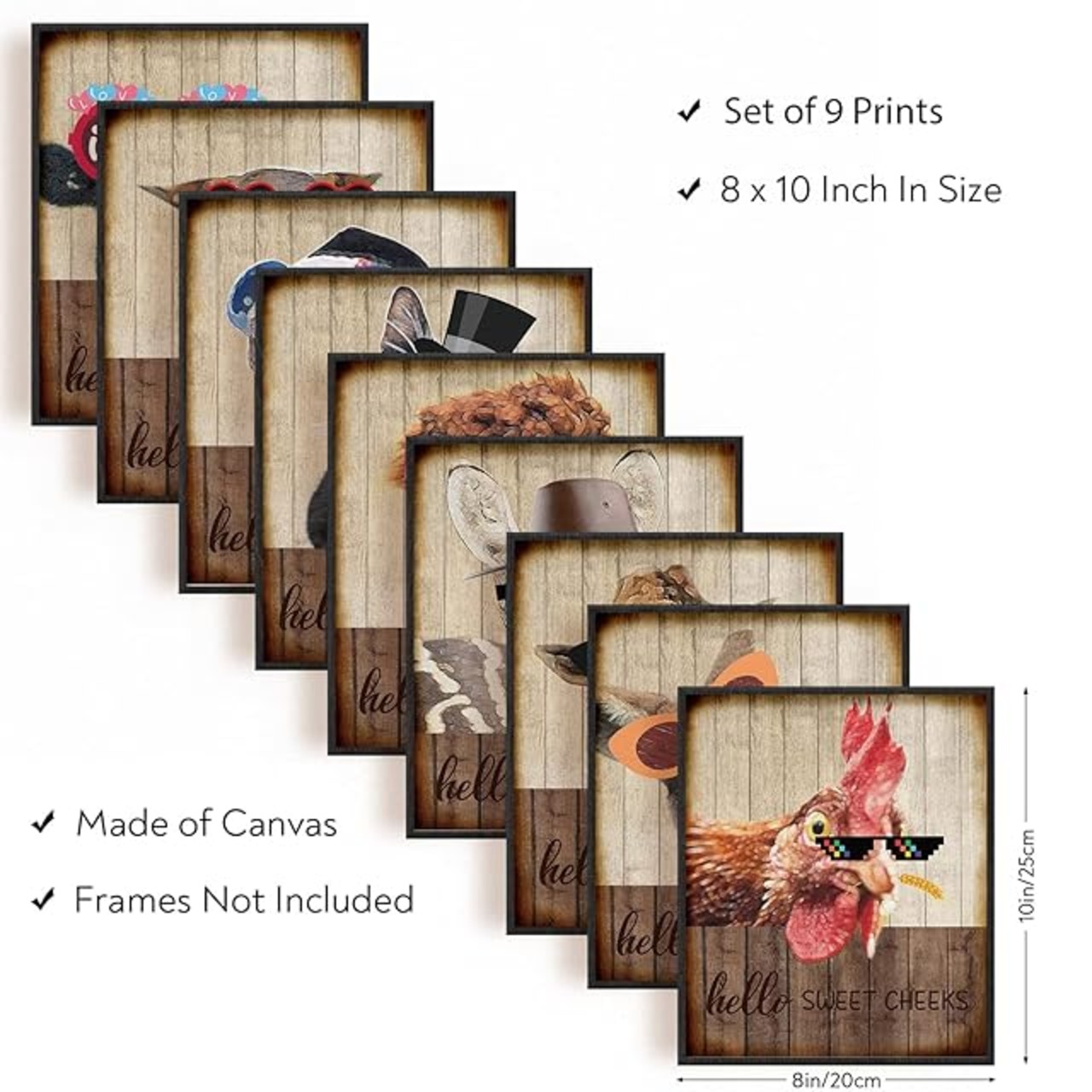 INFUNLY 9点セット 面白い動物 ウォールアート プリント カントリー ヴィンテージ ロバ 眼鏡をかけている 壁ポスター 絵画 フレームなし カラフルな動物 壁アート 寝室 キッチン リビングルーム バスルーム ホーム クリスマス装飾