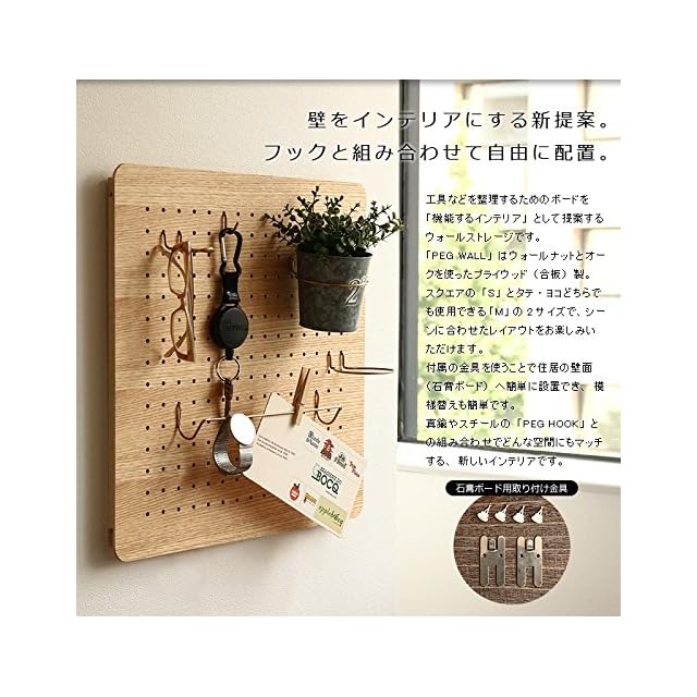 工具などを整理するためのボードを「機能するインテリア」として提案するウォールストレージです。「PEG WALL」はウォールナットとオークを使ったプライウッド(合板)製。スクエアの「S」とタテ・ヨコどちらでも使用できる「M」の2サイズで、シーンに合わせたレイアウトをお楽しみいただけます。付属の金具を使うことで住居の壁面(石膏ボード)へ簡単に設置でき、模様替えも簡単です。真鍮やスチールの「PEG HOOK」との組み合わせでどんな空間にもマッチする、新しいインテリアです。