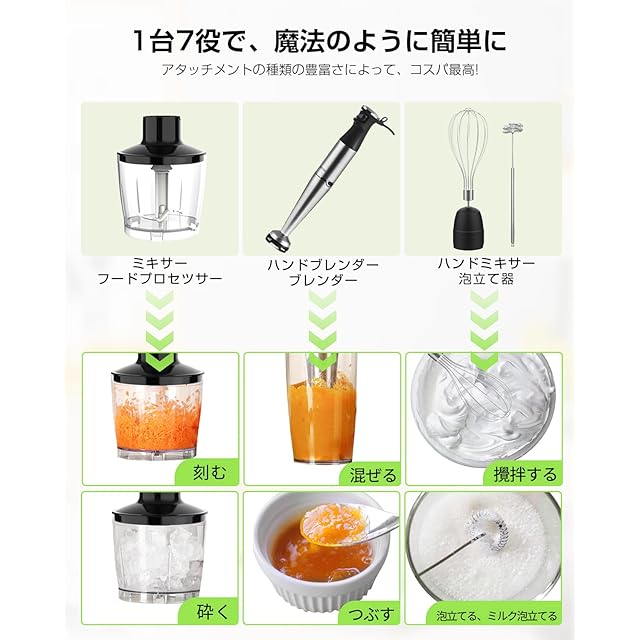 QOOQOOGE ハンドブレンダー 離乳食 ブレンダー 1台7役 【無段階変速•鍋キズ防止】 1000W 強力 電動 ミキサー 氷・肉・果物・野菜 泡立て器 ジューサー フードプロセッサー 調理器具 ハンドミキサー お祝い お手入れ簡単