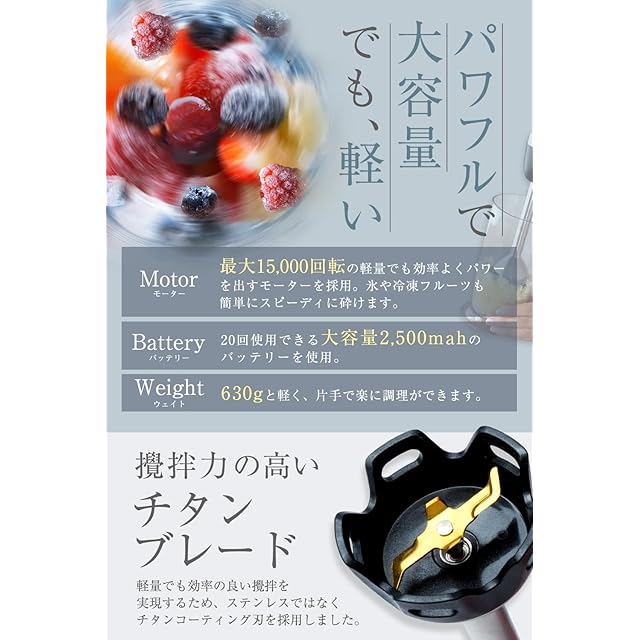 【パワフルで大容量、でも軽い】最大15000回転/分の軽量で効率よくパワーを出すことができるモーターを採用。氷や冷凍フルーツも砕くことができ、おいしいスムージーも作ることができます。バッテリーは2500mahの大容量バッテリーを採用し、満充電時には20回ほどの使用が可能なため、頻繁に充電する必要もなし。重量は業界内でも軽めの630g。誰でもどこでも使えちゃいます。【攪拌力の高いチタンブレード】軽量でも効率の良い攪拌を実現するため、刃にはチタンコーティングを施しています。