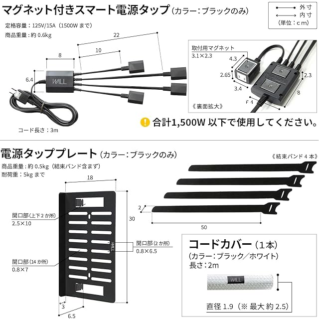 マグネット付きスマート電源タップとコードカバーと電源プレートの3点セットです。