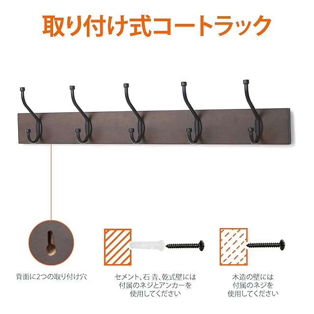 Amazonベーシック 壁掛けフック ウォールハンガー 壁取り付け式 5フック ビンテージ 長方形 エスプレッソ