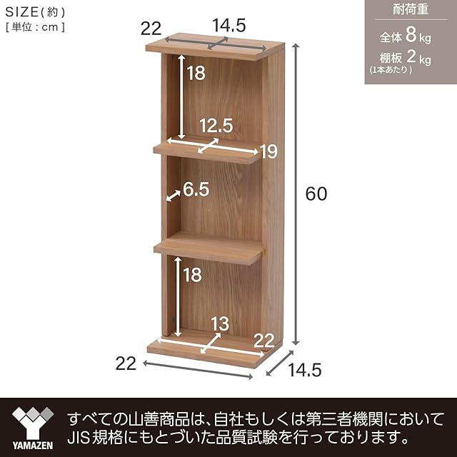 ●本体サイズ:幅22×奥行14.5×高さ60cm●耐荷重 : 全体8kg(棚板1枚あたり : 2kg)●構造部材 : 本体/プリント紙化粧パーティクルボード、プリント紙化粧繊維板 固定用パーツ/ポリアセタール 固定用ピン/金属(ステンレス鋼)