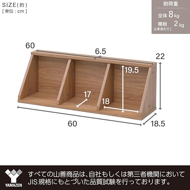 ●本体サイズ:幅60×奥行18.5×高さ22cm●耐荷重 : 全体8kg(棚板1枚あたり : 2kg)●構造部材 : 本体/プリント紙化粧パーティクルボード、プリント紙化粧繊維板 固定用パーツ/ポリアセタール 固定用ピン/金属(ステンレス鋼)
