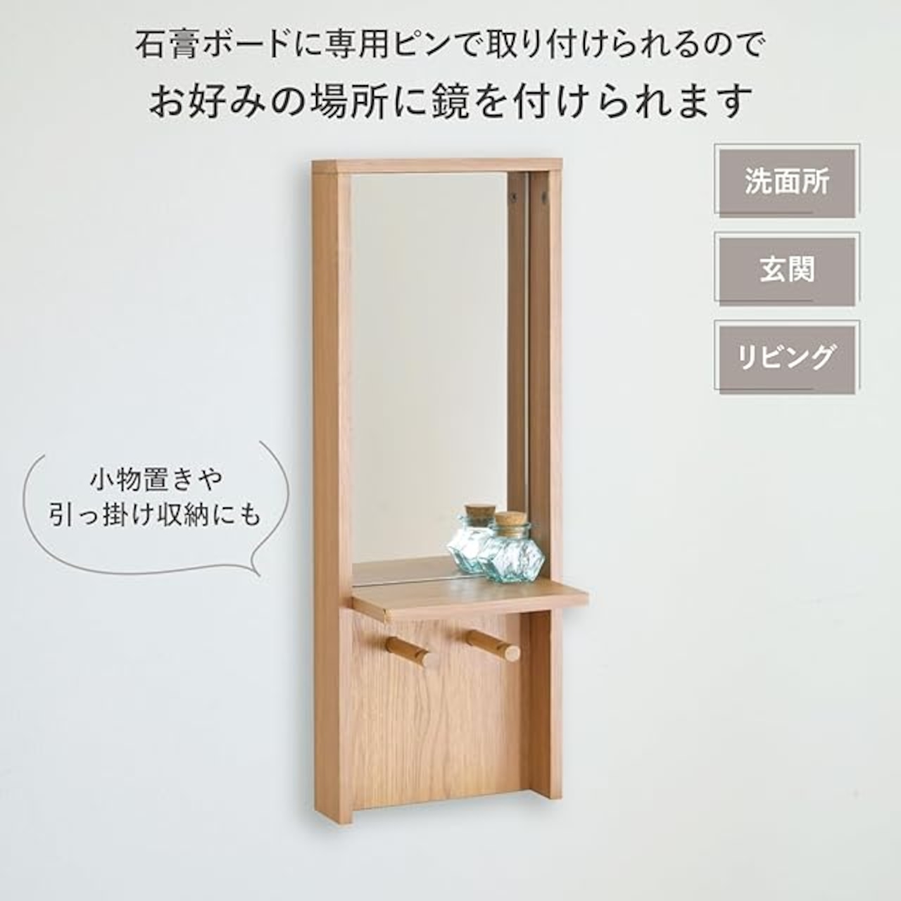 【お好きな場所にミラーを】ちょっとした小物が置ける台と、引っ掛け収納に便利なフックが2個ついた玄関や洗面所などにぴったりの壁掛け鏡です。